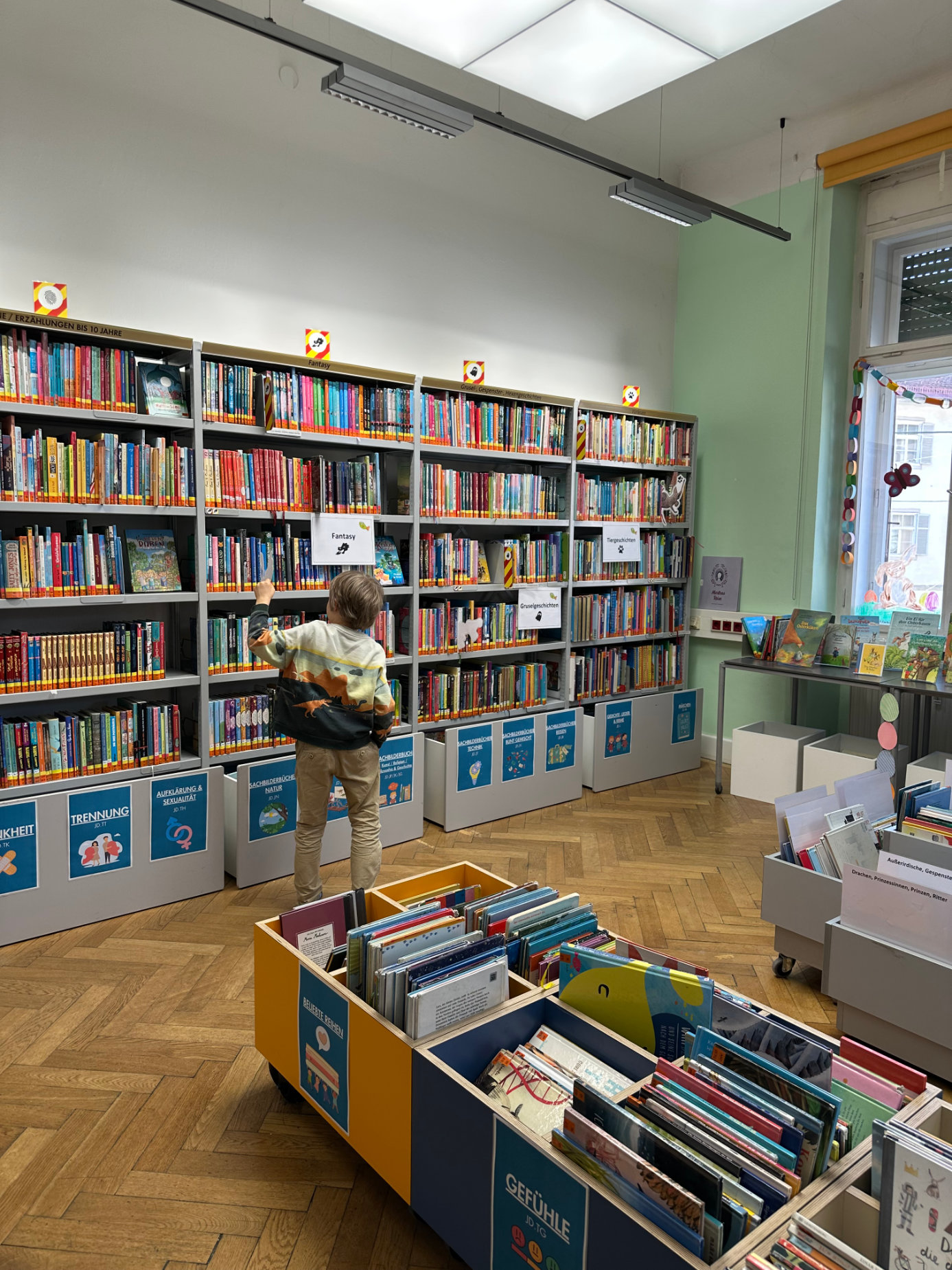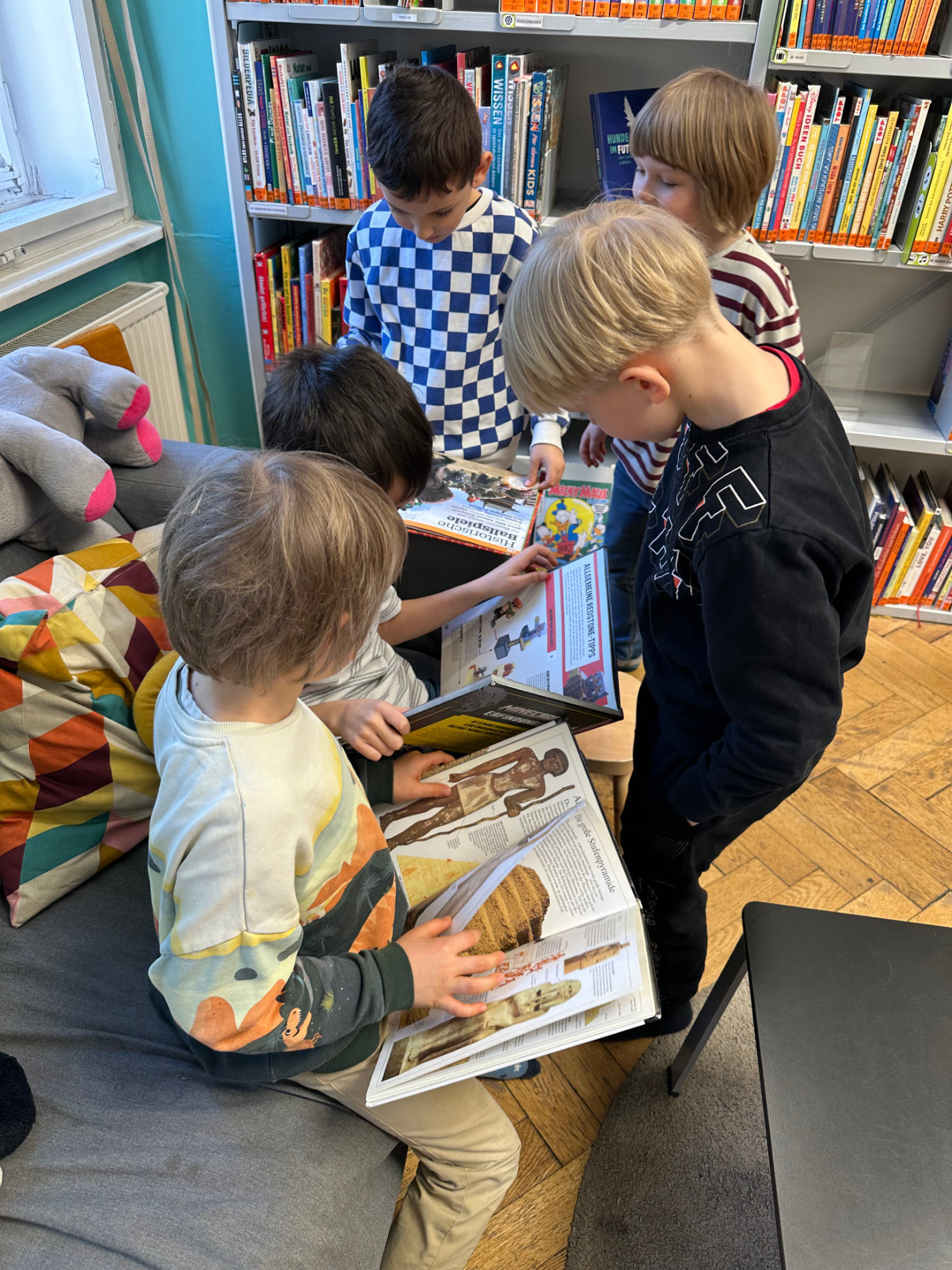 Danach wurde es richtig aufregend: In der Bibliothek hatten sich kleine Mäuse versteckt! Gemeinsam machten wir uns auf die Suche nach ihnen. Dabei lernten wir auch die verschiedenen Bereiche der Bibliothek kennen und erfuhren, wo man welche Bücher finden kann.